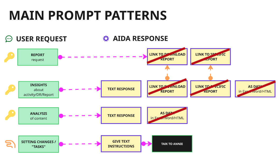 Initially, our vision was to enable customers to freely query reports and deal data from Aida, but this was deemed as unfeasible for first release, so we had to launch and build Aida with a controlled set of pre-written prompts.